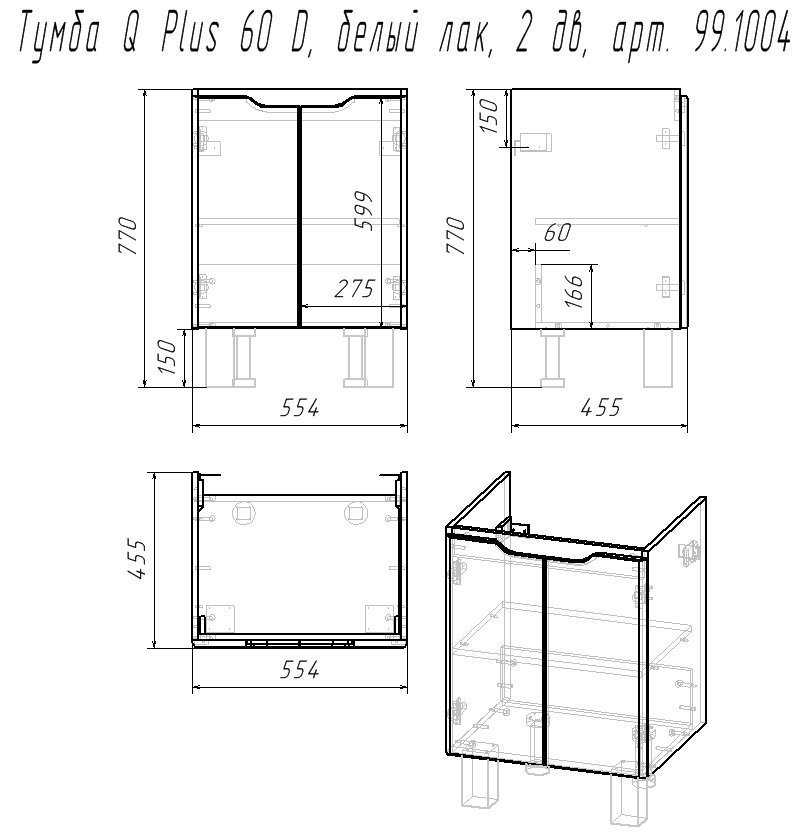 | Название: | Тумба Q PLUS (D), 60 см, подвесная/напольная, 2 дверцы, с опорами, белый глянец | ||