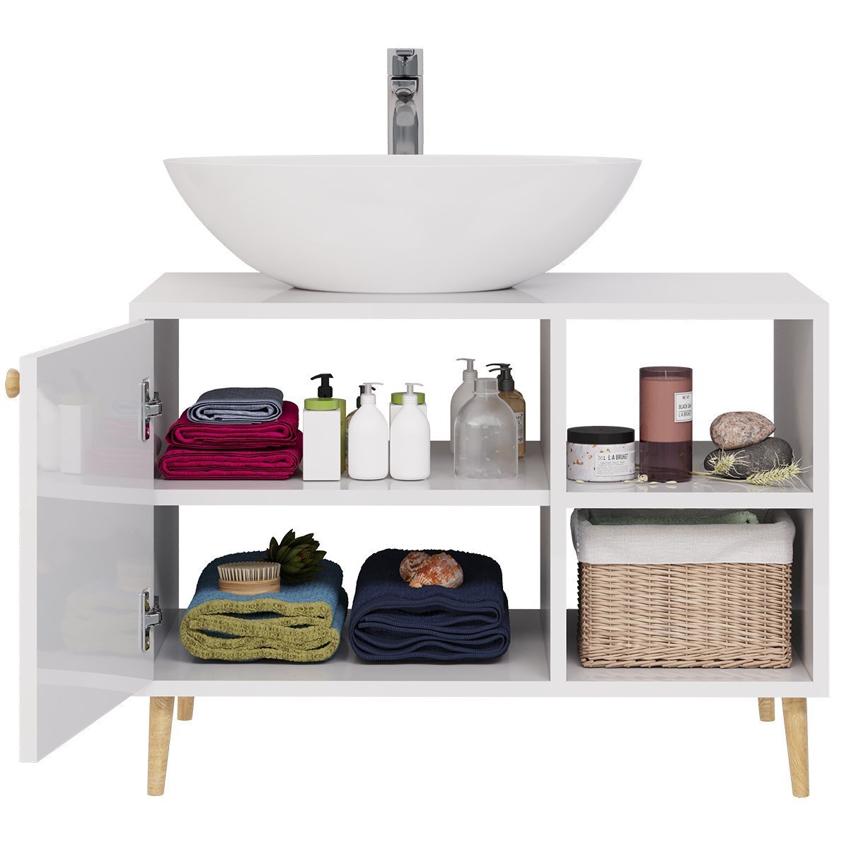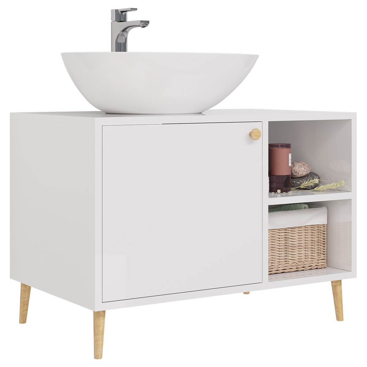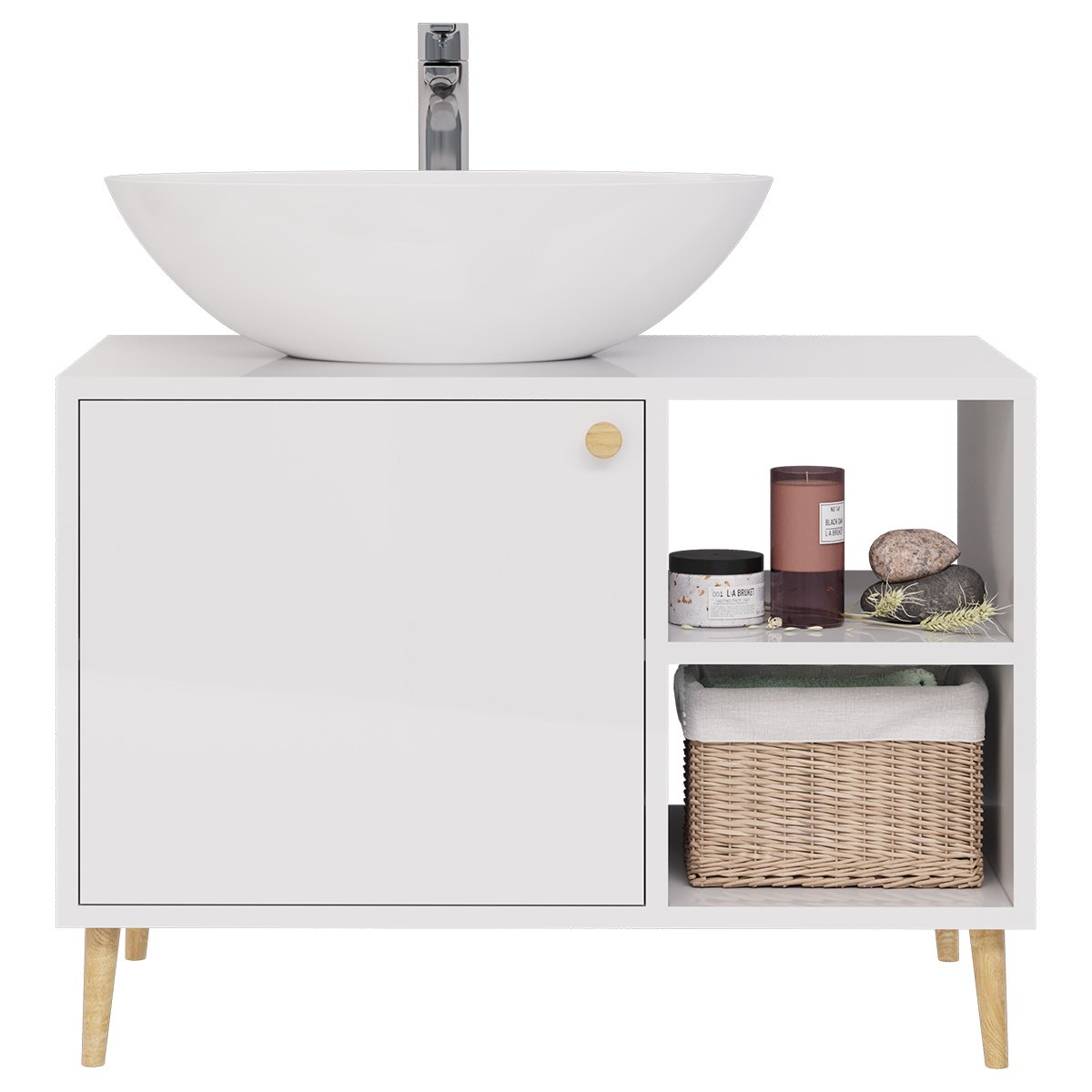 Тумба LUNO, 80 см, напольная, 1 дверца, 2 открытые полки, белый глянец, под умывальник Триумф