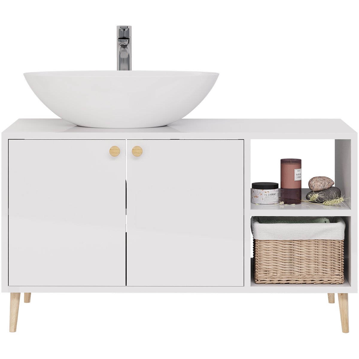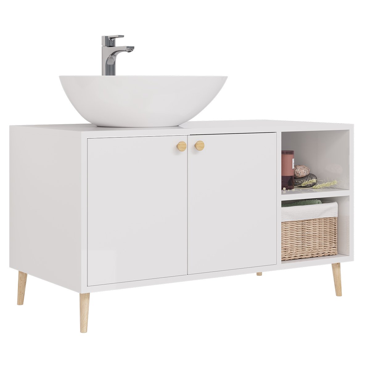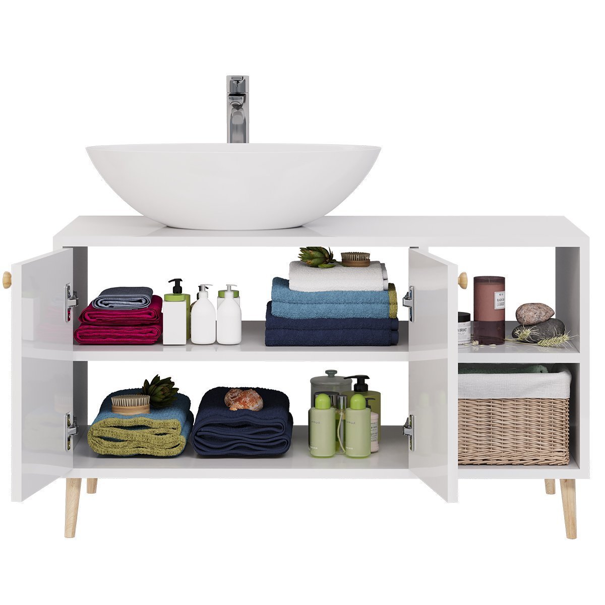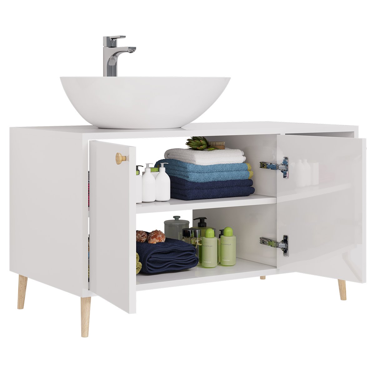 Тумба LUNO, 100 см, напольная, 2 дверцы, 2 открытые полки, белый глянец, под умывальник Триумф