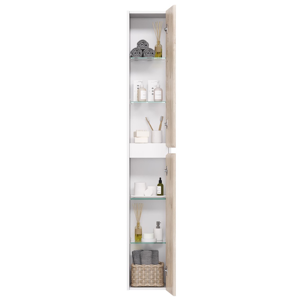 Пенал SLIM, 30 см, подвесной/напольный, универсальный, 2 дверцы, 4 стеклянные полки, дуб кантри/белый глянец