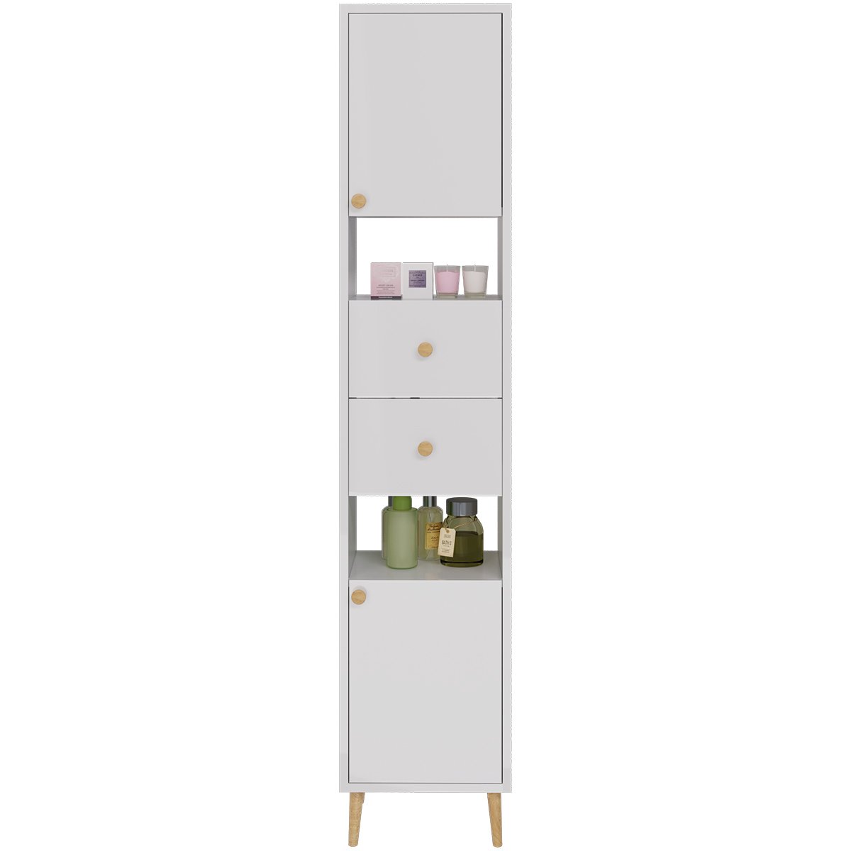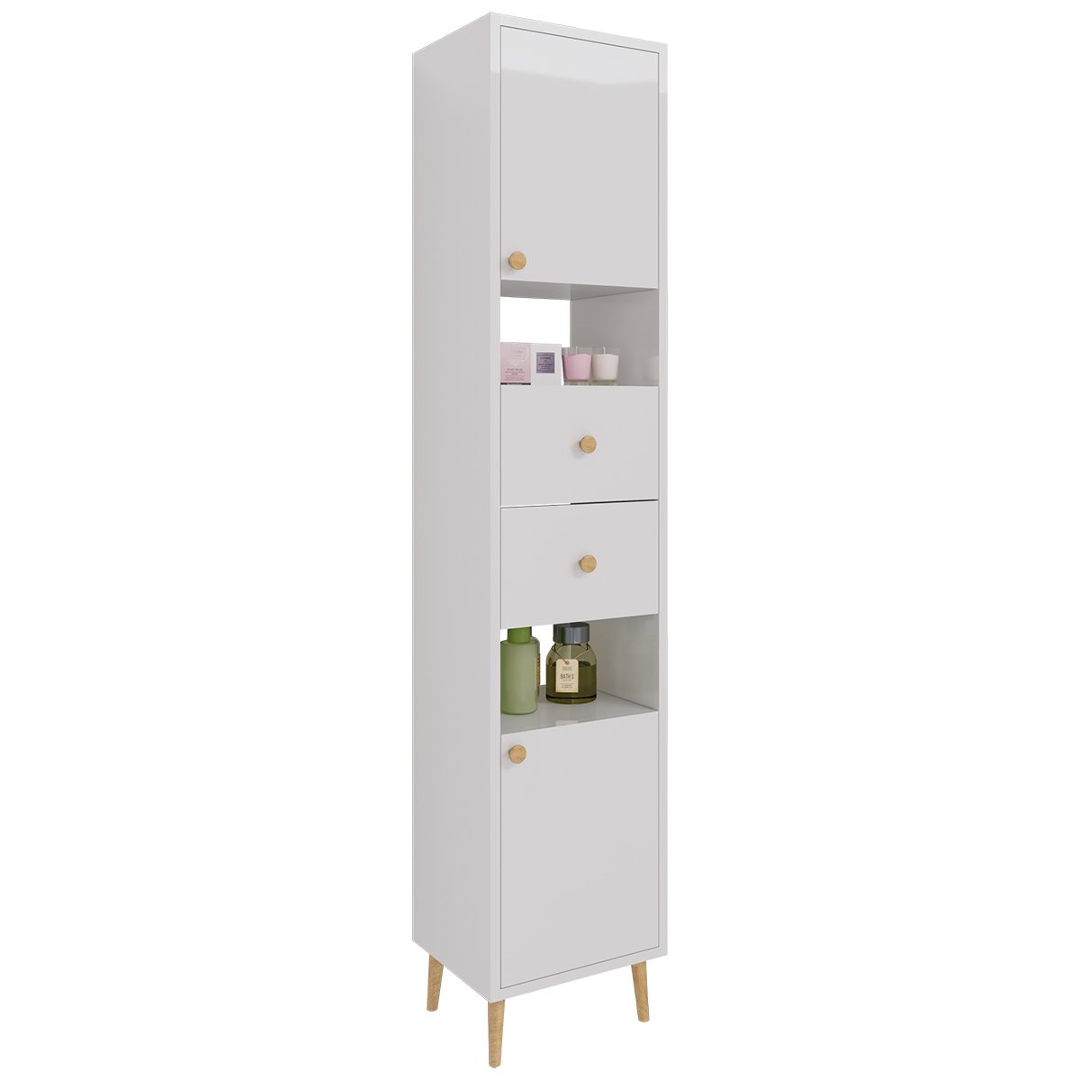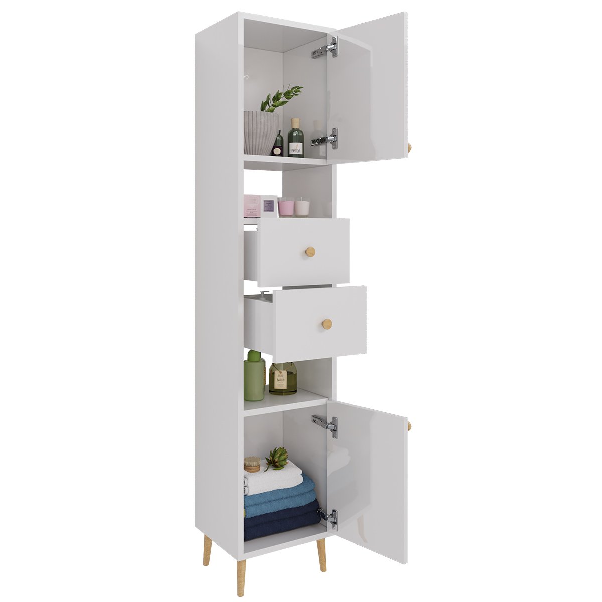 Пенал LUNO, 35 см, напольный, правый, 2 дверцы, 2 ящика, 2 открытые полки, белый глянец