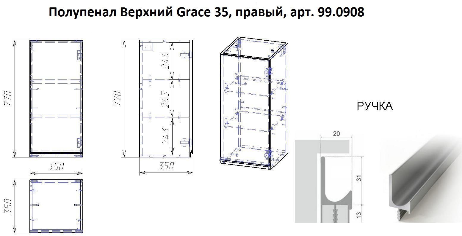 | Название: | Полупенал GRACE, 35 см, подвесной, правый, 1 дверца, 2 стеклянные полки, белый глянец | ||