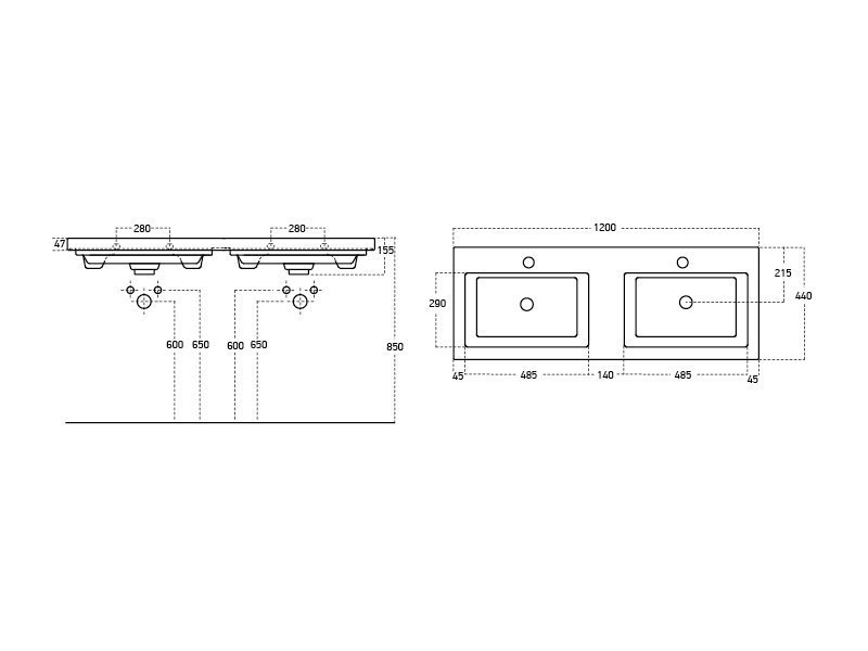 HARMONIA, 125 см, мебельный умывальник, керамический, две чаши