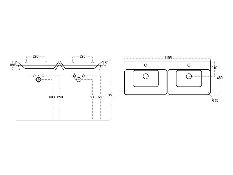 HARMONIA, 125 см, мебельный умывальник, керамический, две чаши
