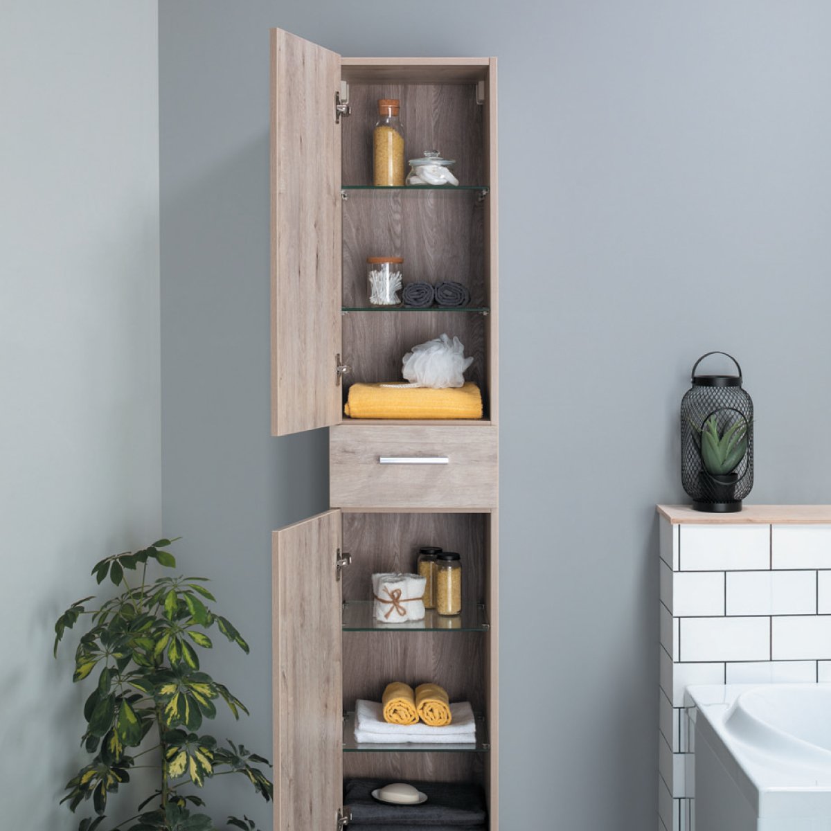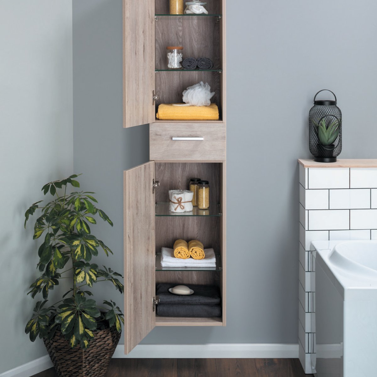Пенал, 35 см, подвесной/напольный, универсальный, 2 дверцы, 1 ящик, 4 стеклянные полки, дуб кантри