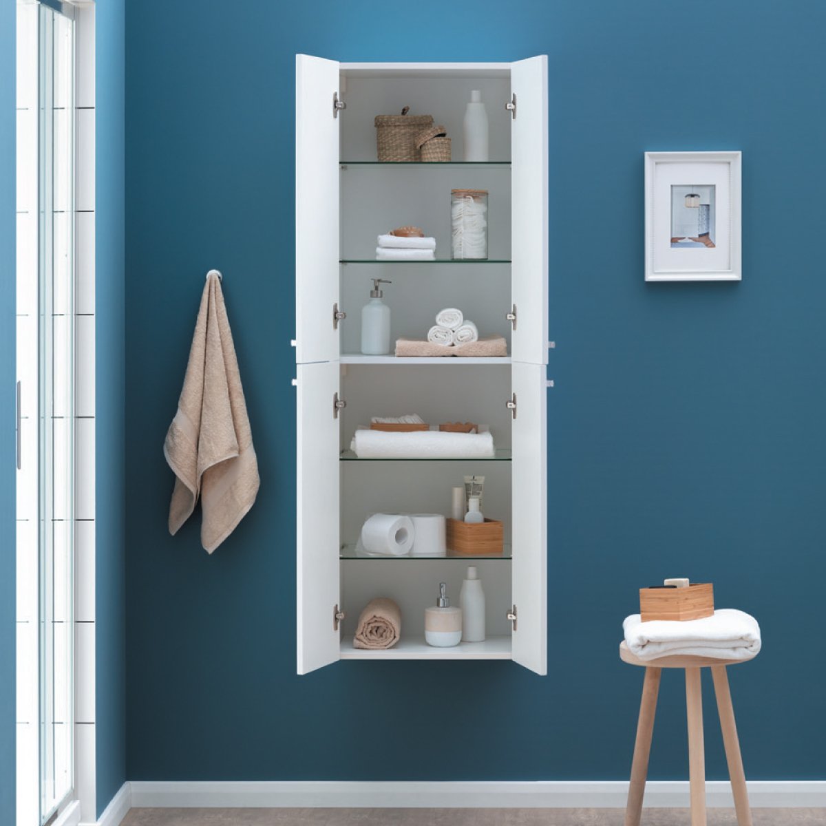 Пенал, 50 см, подвесной/напольный, универсальный, 4 дверцы, 4 стеклянные полки, белый глянец