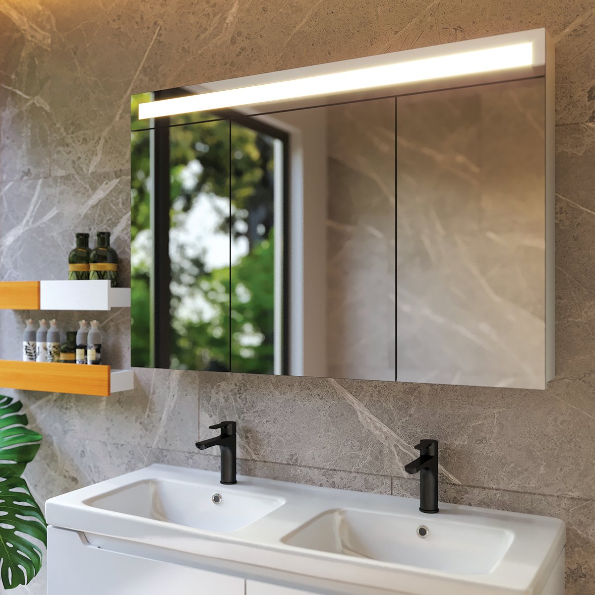 Шкаф зеркальный UNI, 120 см, 3 дверцы, 6 стеклянных полок, с LED-подсветкой и выключателем, белый